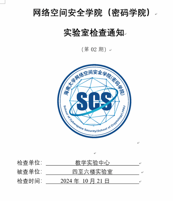 根据学校做好实验室安全工作要求,为保障学院教学、科研工作顺利进行,切实保障师生人身财产安全,消除安全隐患,2024年10月10日,网1683168 3诸侯快讯入口(密码学院)张殿副院长、教学实验中心谭毓银主任对教学科研实验室进行常规安全检查,重点对用电安全、消防设施完好、实验室卫生等方面进行检查。检查后,学院对部分实验室下达《实验室检查整改通知》,要求2024年10月20日前整改完成。2024年10月21日,检查小组再次对《整改通知》中涉及的实验室进行复检,各实验室均完成了整改。