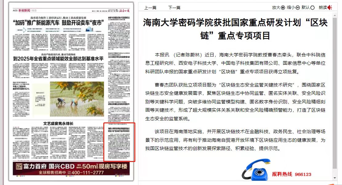 曹春杰团队获批立项项目是海南大学“十四五”期间获批的首个国家重点研发计划项目,标志着该校在区块链基础理论研究、共性关键技术攻关、重大系统集成示范等方面已经形成特色优势,将进一步提升该校在密码学与区块链研究领域的影响力,有力支撑示范性密码学院创建工作。