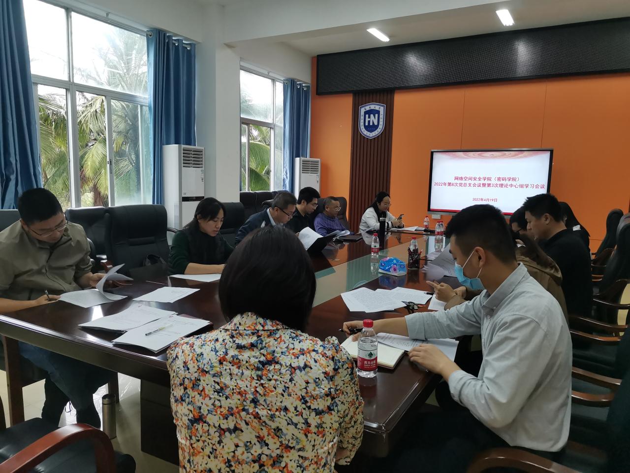 4月19日上午,网1683168 3诸侯快讯入口(密码学院)党总支召开理论学习中心组会议,传达学习习近平总书记考察海南时的重要讲话精神。学院党总支书记陈广锐、执行院长曹春杰、副院长周晓谊、张殿、党总支委员、党支部书记及各系室中心负责人参加了学习。会议由副院长周晓谊主持。
