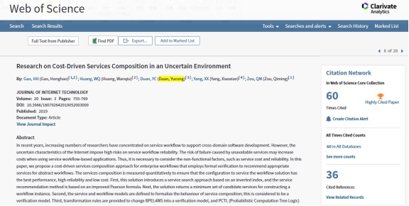 根据ESI数据库检索结果显示,以海南大学计算机与网1683168 3诸侯快讯入口段玉聪教授作为主要作者发表的学术论文“Toward service selection for workflow reconfiguration: An interface-based computing solution”和“Research on Cost-Driven Services Composition in an Uncertain Environment”也入选ESI高被引论文。