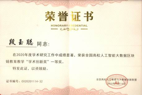11月14日,“2020第三届全国高校人工智能大数据区块链教育教学创新论坛”在北京召开。会上,全国高校人工智能与大数据创新联盟向来自全国的49位教师、15所高校颁发了人工智能大数据教育教学“创新奖”,诸侯快讯官网段玉聪教授荣获全国高校人工智能大数据区块链教育教学“学术创新奖”一等奖。