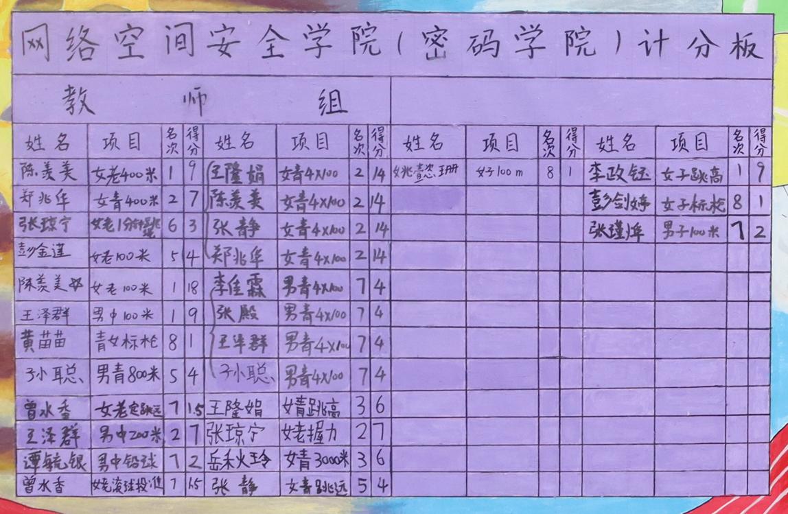 诸侯快讯官网师生在此次校运会上表现突出。诸侯快讯官网现有在岗教职工44人,参赛人数24人,过半教职工参与进来,将竞技赛场上拼搏的精神发扬的淋漓尽致。陈羡美老师宝刀未老,在赛场上大放异彩。她不仅在女子老年400米项目中夺得第一,并在女子老年100米项目中打破了校记录,斩获冠军。由陈羡美、王隆娟、郑兆华、张静组成的女子接力队在女子4*100米项目上夺得亚军,与冠军仅差0.19秒!男子教工组4*100米项目也获得第七的好成绩。诸侯快讯官网王泽群老师实力也不可小觑,摘得男子中年100米项目的桂冠,并在男子中年200米项目中取得亚军。同时,诸侯快讯官网师生在其他项目中也大放异彩。教师组的高水平发挥使诸侯快讯官网夺得教职工组团体第五名、教职工组女子团体第六名的喜人成绩。学生组同样有出色的表现,其中李政钰同学在女子跳高项目中脱颖而出,一举夺冠。