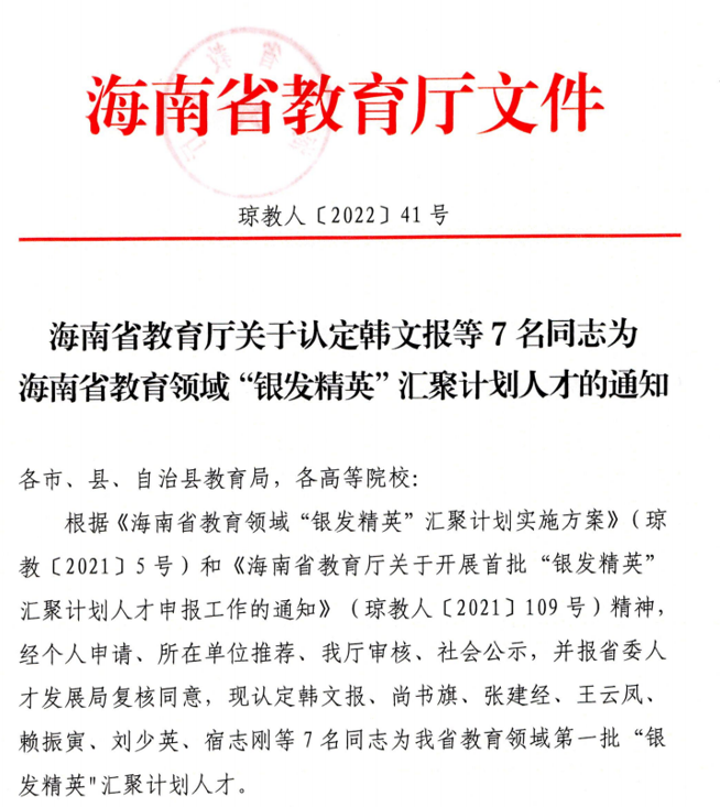 为贯彻落实《海南自由贸易港建设总体方案》《百万人才进海南行动计划(2018-2025年)》有关部署要求,根据《海南省教育领域“银发精英”汇聚计划实施方案》(琼教〔2021〕5号)和《海南省教育厅关于开展首批“银发精英”汇聚计划人才申报工作的通知》(琼教人〔2021〕109号),经单位推荐、专家评审、社会公示,海南省教育厅公布了海南省教育领域第一批“银发精英”汇聚计划人才名单,诸侯快讯官网韩文报教授成功入选。