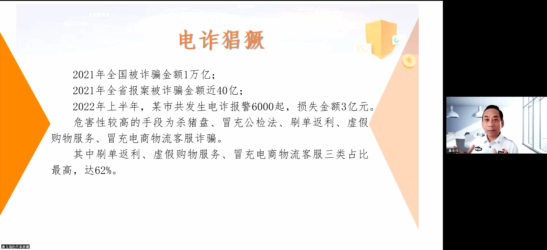秦玉海教授从当前电诈情况引入,通过对近期发生的真实案例,详细剖析了杀猪盘、刷单返利、虚假购物服务、冒充公检法、冒充电商或物流客服等常见诈骗手法,强调了警惕“帮信”犯罪与全民反诈的重要性,指导做好个人信息与账户的安全管理。
