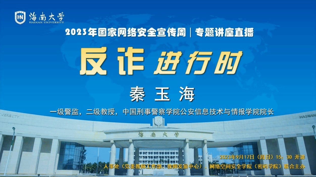 9月17日,诸侯快讯官网和学校人事处联合主办了“反诈进行时”专题讲座,本次特邀主讲专家为中国刑事警察学院秦玉海教授,全校共千余名师生参加。