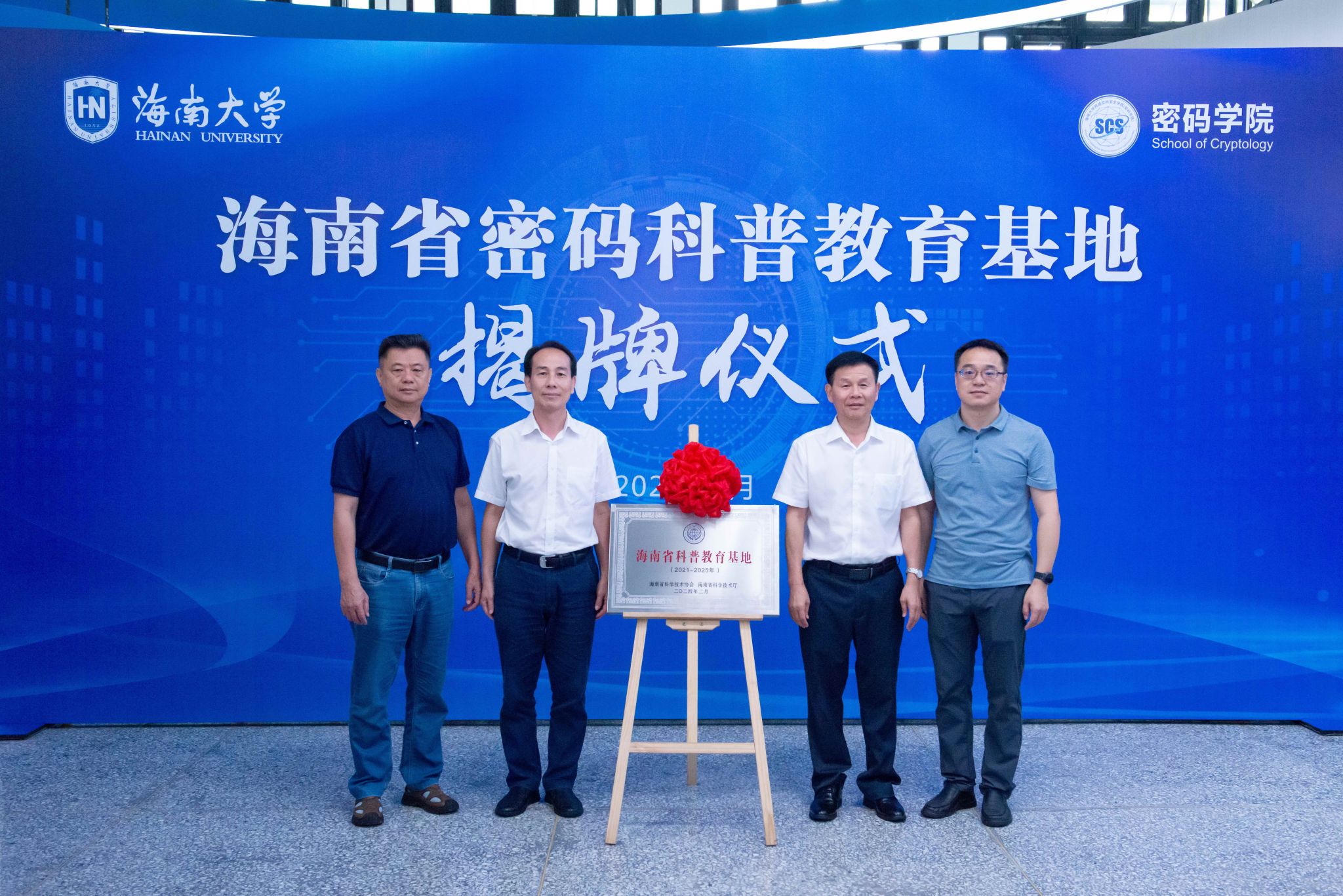 揭牌仪式上,海南省国家密码管理局局长蔡国杰,海南省科学技术协会二级巡视员吴钟海,海南省科学技术厅政策法规规划处副处长覃业敏,海南大学党委常委、副校长刘谦共同为海南省密码科普教育基地揭牌。
