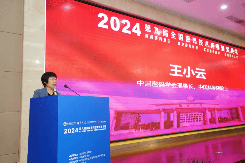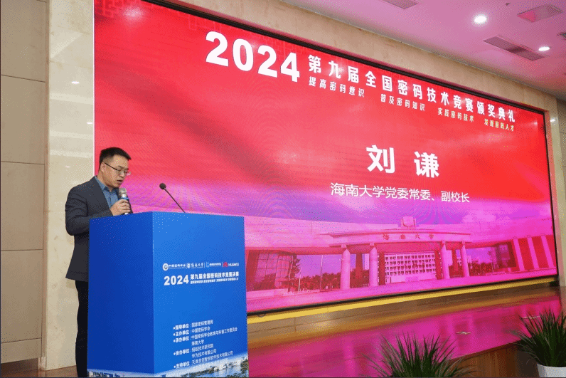 11月28日-30日,2024第九届全国密码技术竞赛决赛在海南大学顺利举办,中国密码学会理事长、中国科学院院士王小云,中国密码学会副理事长、秘书长安晓龙,海南省国家密码管理局局长蔡国杰,海南大学党委常委、副校长刘谦,中国密码学会副理事长戚文峰,中国密码学会副理事长谷大武,中国密码学会副秘书长王瑶,海南大学密码学院院长曹春杰、书记陈广锐,华为中国区网络安全与隐私保护CTO冯运波出席颁奖典礼。