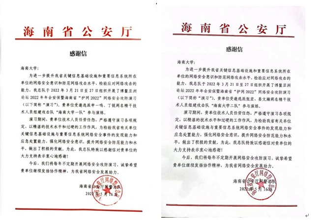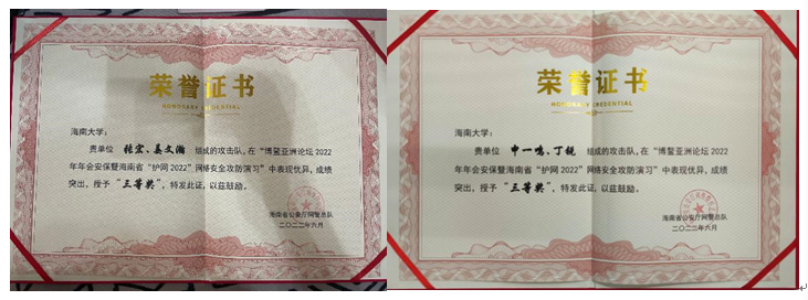 2022年3月21日至27日,海南省公安厅举行博鳌亚洲论坛2022年年会安保暨海南省“护网2022”网络安全攻防演习,诸侯快讯官网学生申一鸣、姜文瀚、张宏及计算机科学与技术学院丁锐作为代表受邀参加演习,顺利完成了网络实战攻防演习任务,并取得三等奖的优异成绩。